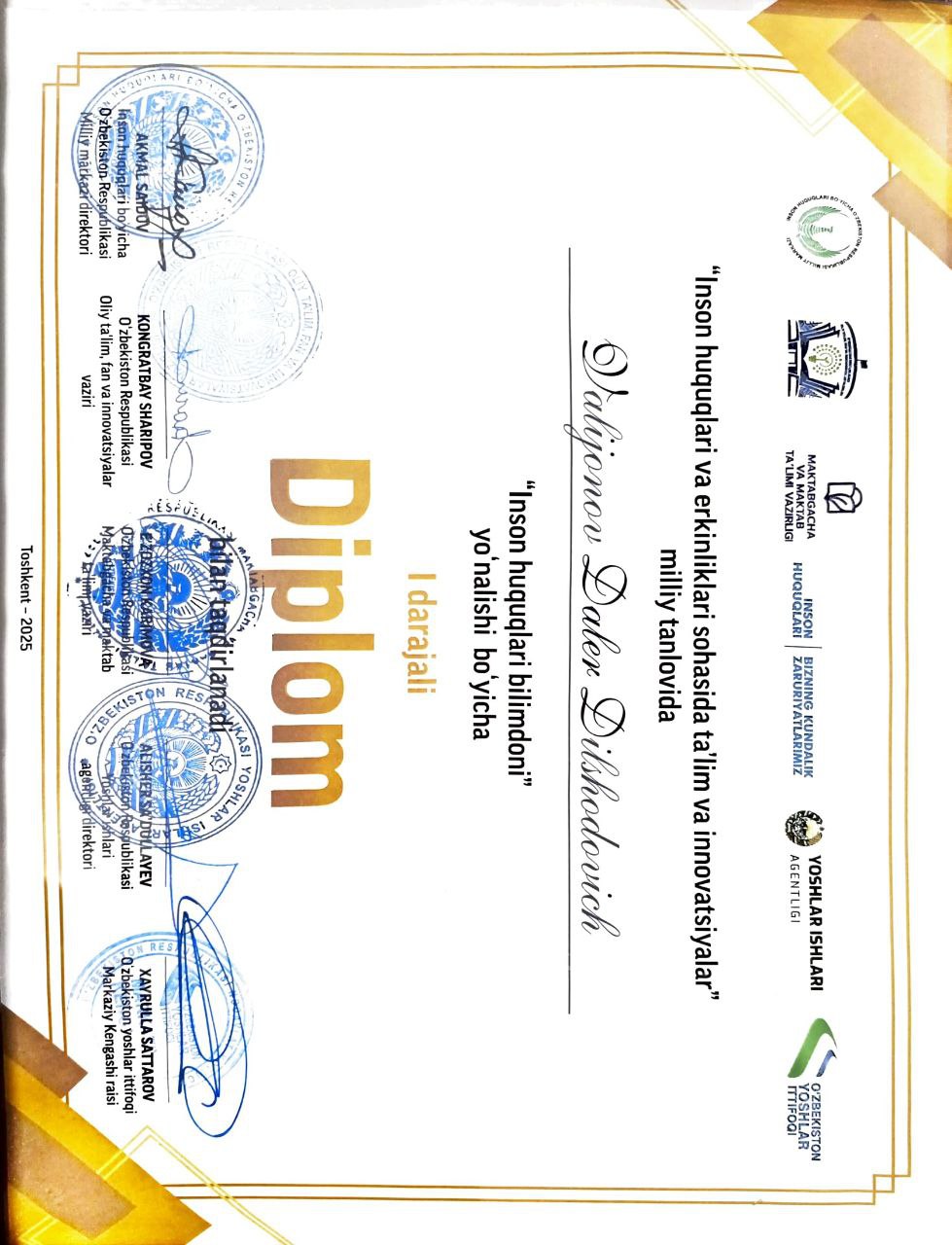 On December 23, 2025, an award ceremony for the winners of the national competition “Education and Innovation in the Field of Human Rights and Freedoms” was held at the National Center for Human Rights of the Republic of Uzbekistan.